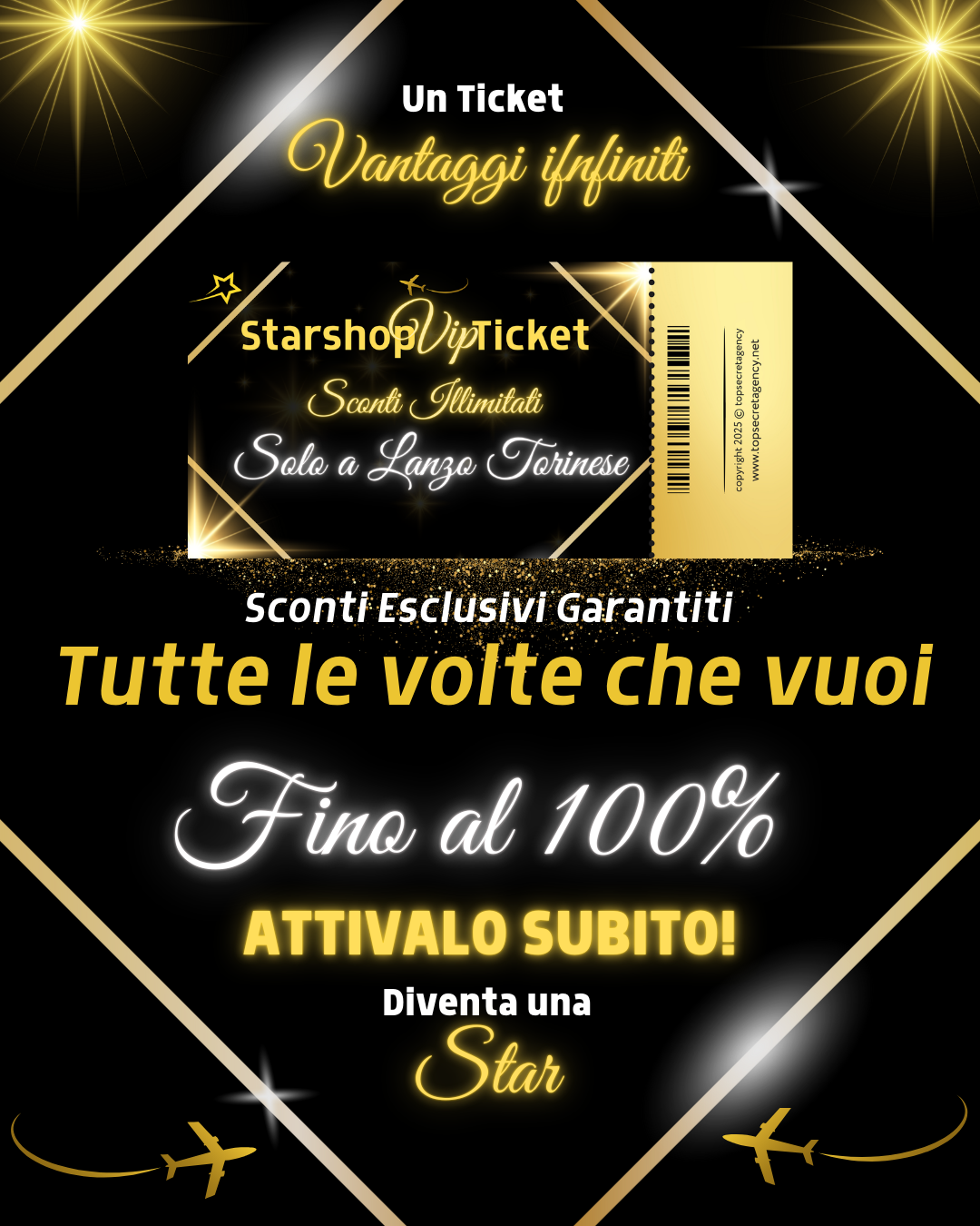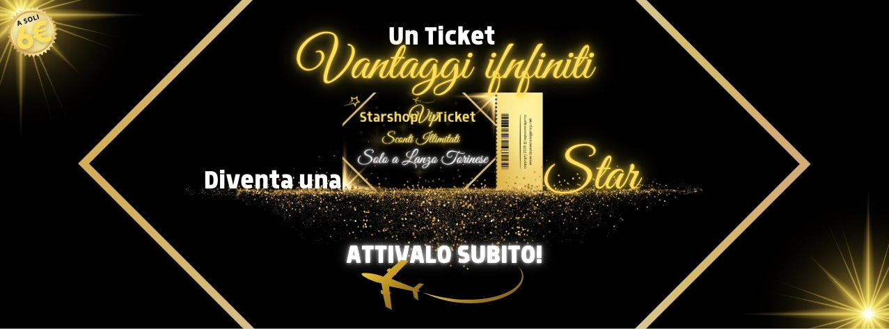 Vieni a Lanzo Torinese, visita le nostre Stelle. Consulta il Nostro Depliant. Troverai tutti i Nostri Partner e tutti i CODICI SCONTO necessari per attivare il tuo STARSHOP VIP TICKET personale. Per Te due mesi di sconti illimitati al prezzo di UNO. Entra e guarda l'offerta!