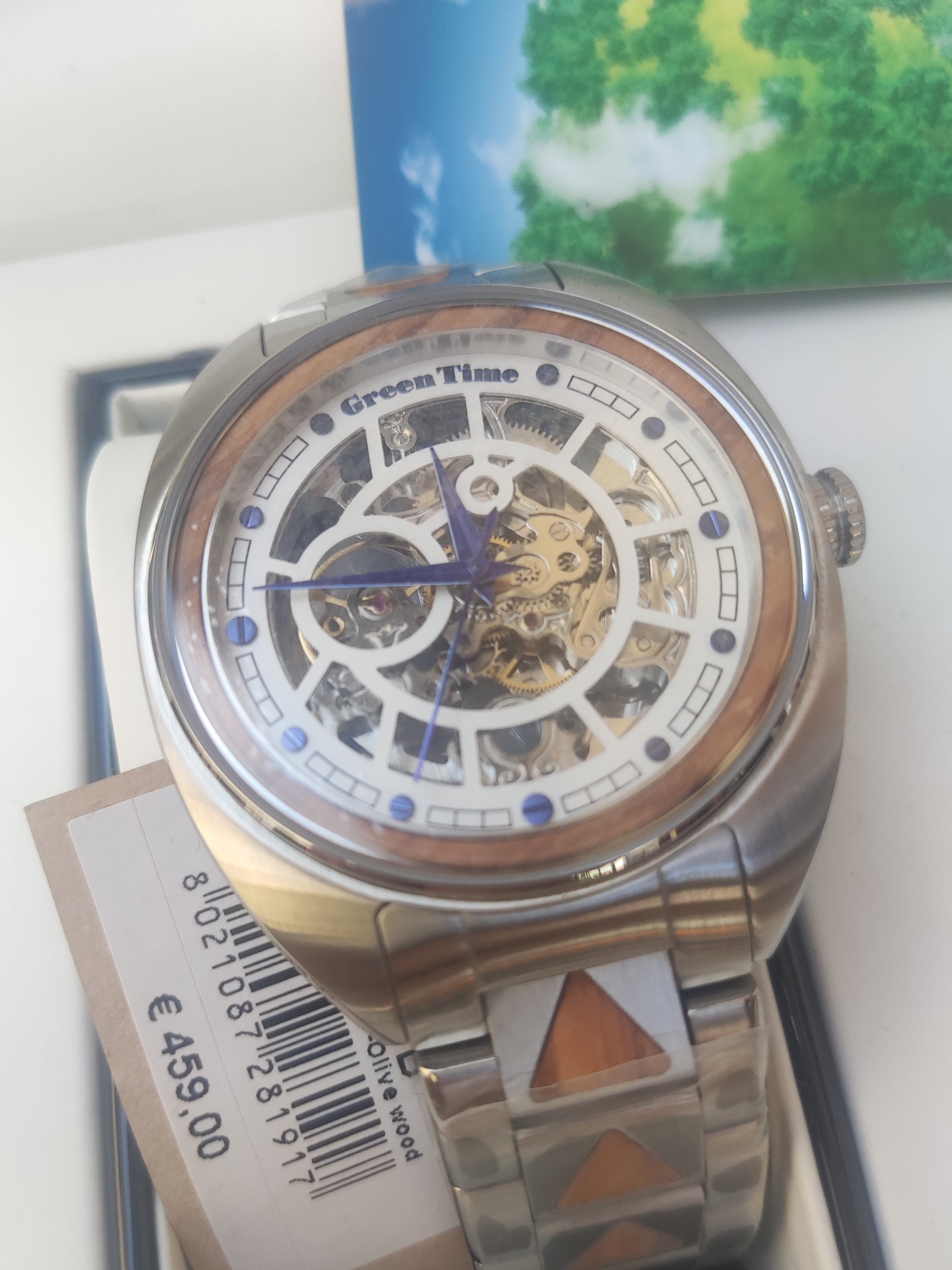Green Time Automatic Skeleton (acciaio inox con inserti in legno). Quadrante scheletrato che mette in mostra il movimento automatico.