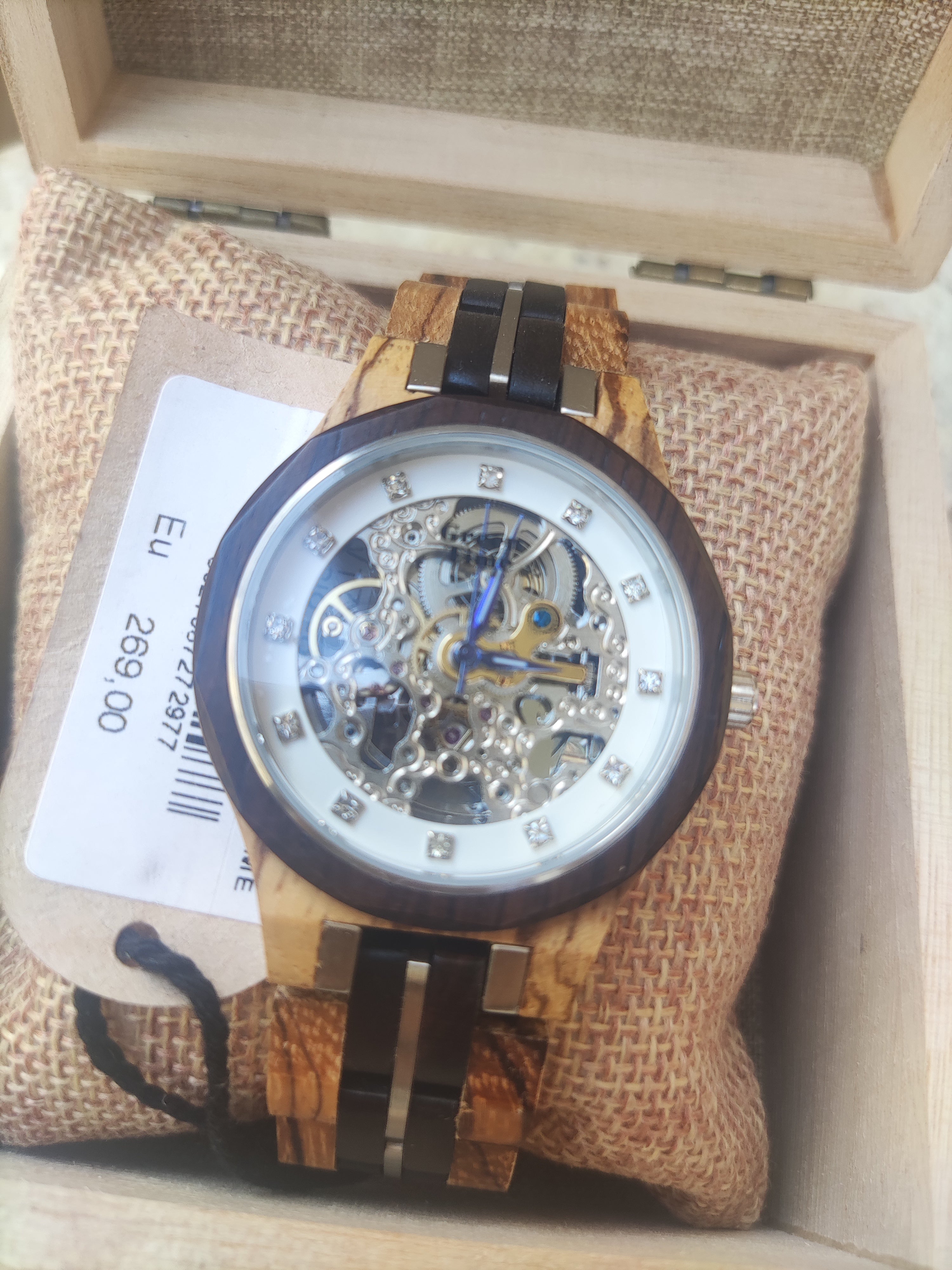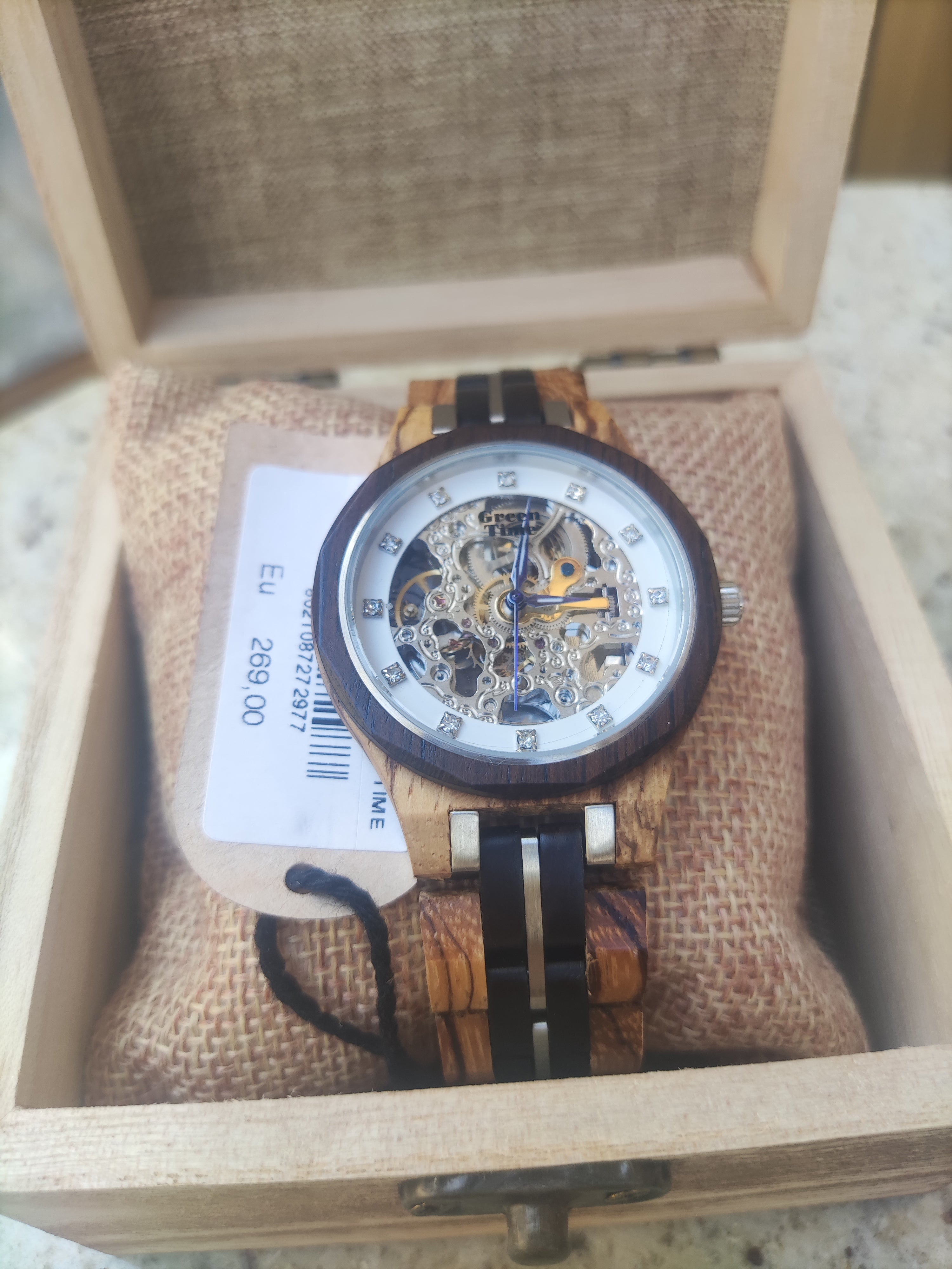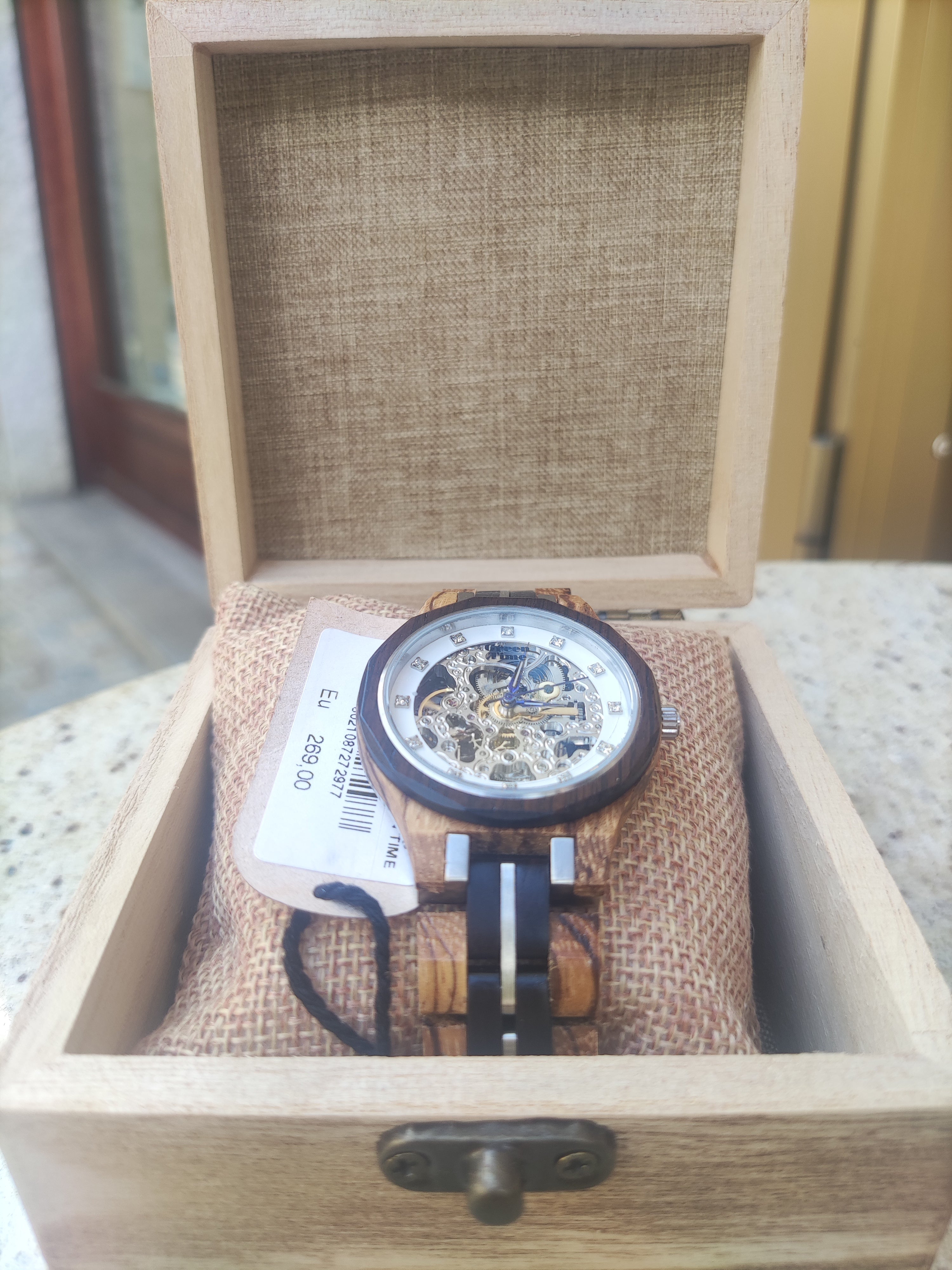 Movimento automatico (senza batteria). Packaging in legno ecosostenibile