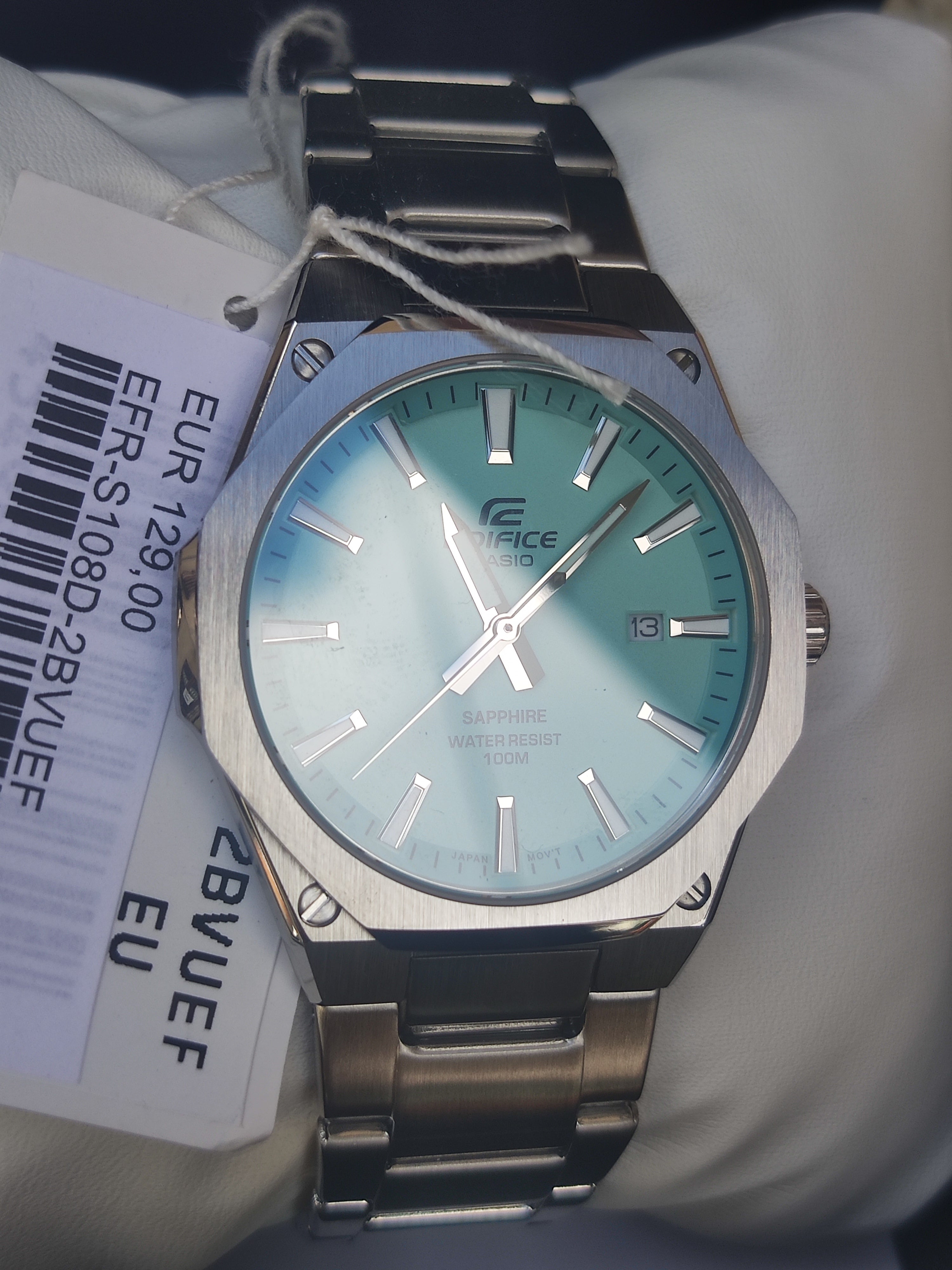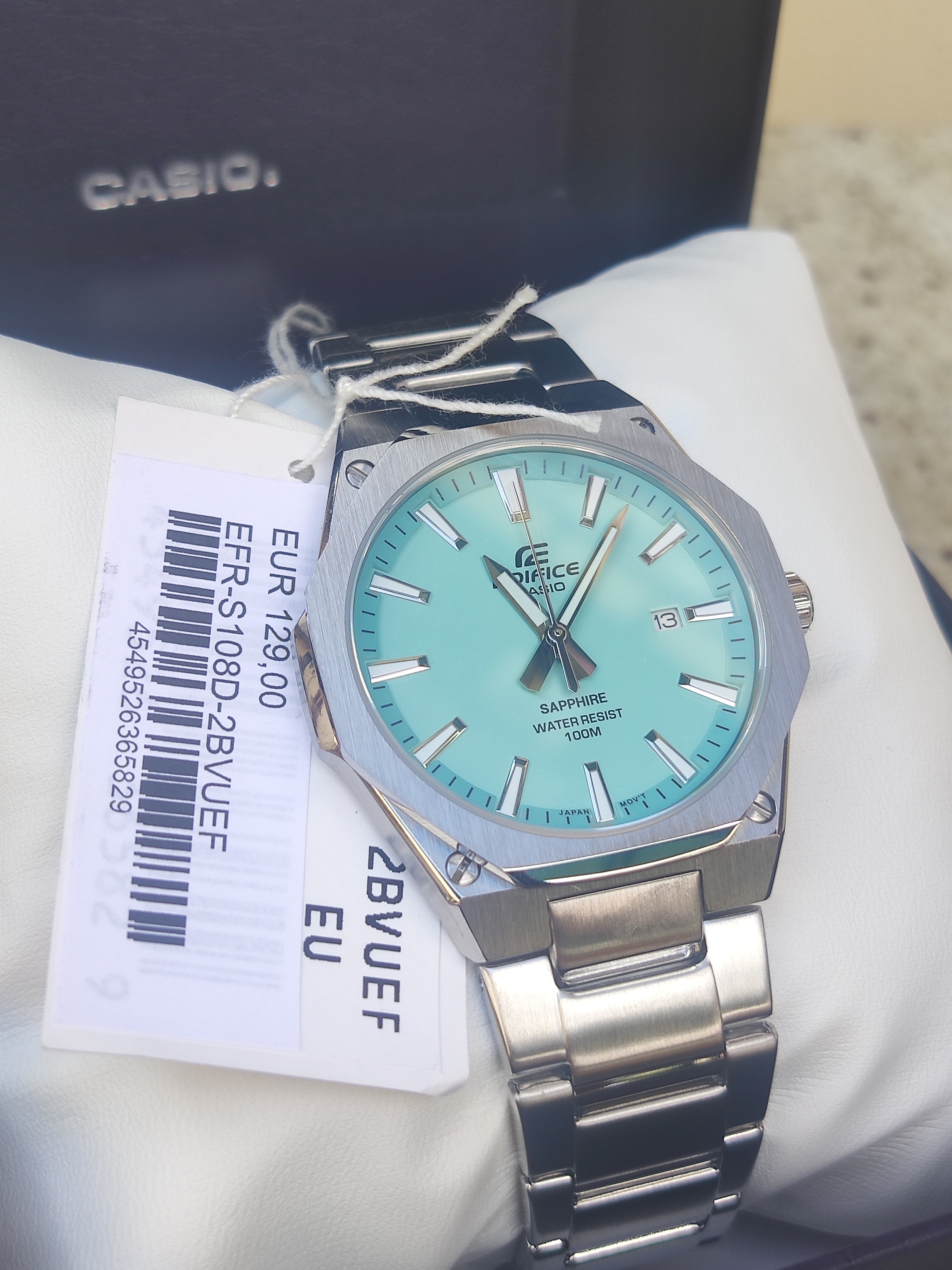 Collezione Edifice, linea sportiva ed elegante di Casio. Quadrante azzurro turchese con indici a bastone luminosi.